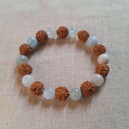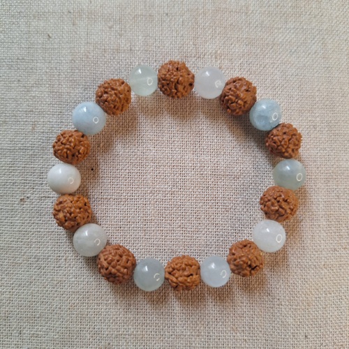 Combinarea rudraksha cu acvamarin creează o brățară cu o vibrație specială, în care energia spirituală a tradiției se întâlnește cu energia calmă și clarificatoare a cristalelor.