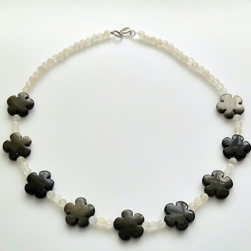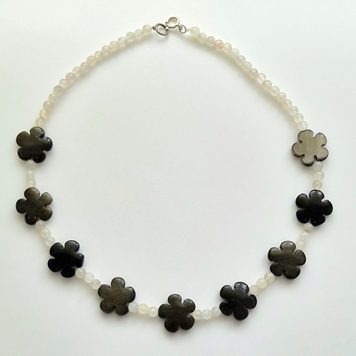 În acest colier, energia delicată a pietrei lunii este completată de flori din obsidian, un cristal puternic de protecție. Obsidianul este asociat cu ancorarea și protejarea energetică, fiind considerat un scut împotriva energiilor negative.