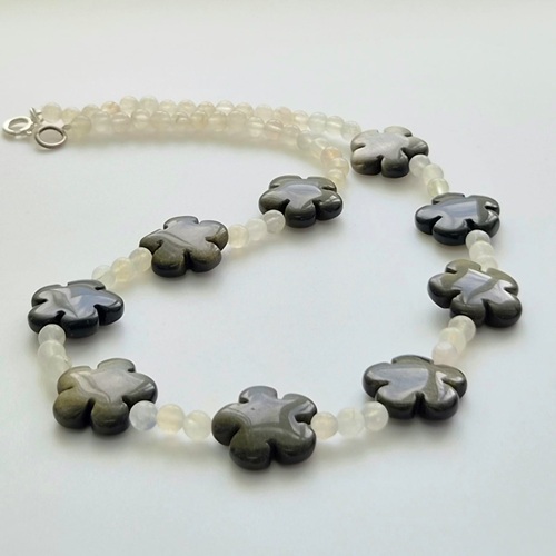 Colierul este realizat din cristale fine de piatra lunii de 5 mm, oferind un aspect elegant și delicat, iar elementele din obsidian devin puncte de atracție prin forma lor specială.